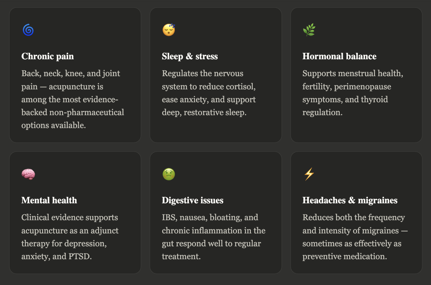 This is not an exhaustive list. Acupuncture is also used to support immune function, speed recovery from injury or surgery, and promote overall vitality in people who simply want to feel their best.